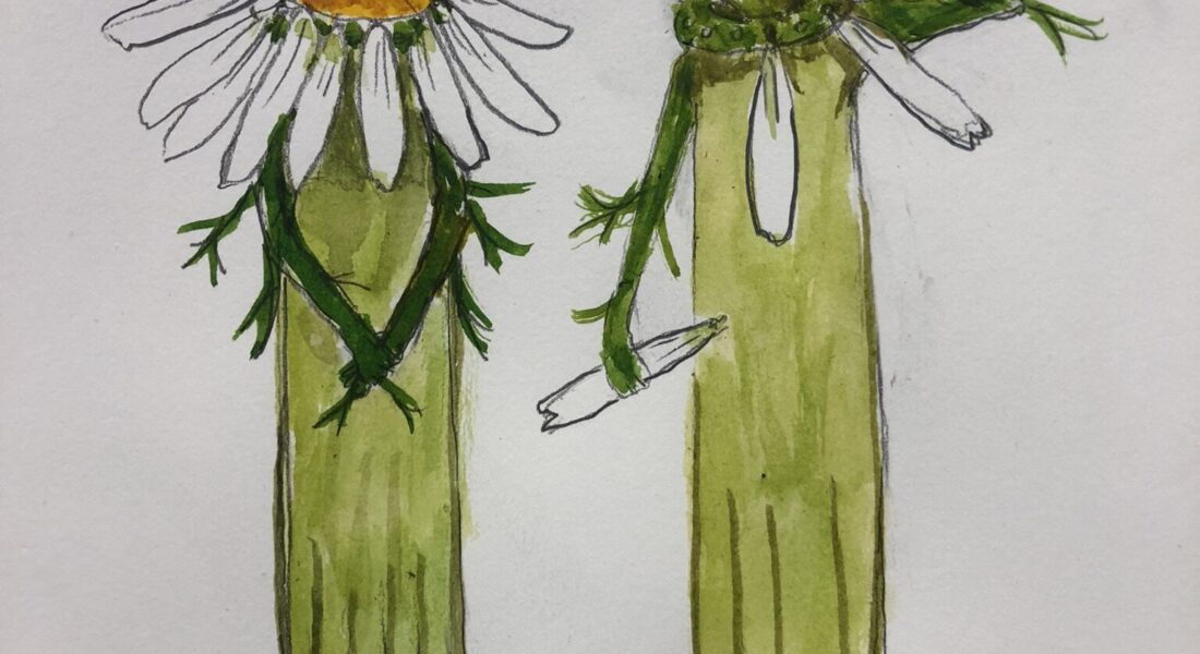 ELSKER, ELSKER IKKE er to hæklede tusindfryd-hatte med hvide kronblade. Bladede kan trækkes ud, én efter én, for at give svar på dit hjertets spørgsmål. Gæsterne på Munkeruphus kan plukke blomsternes blade eller selv tage hattene på og stille sig til rådighed for andre inden for udstillingens åbningstid.