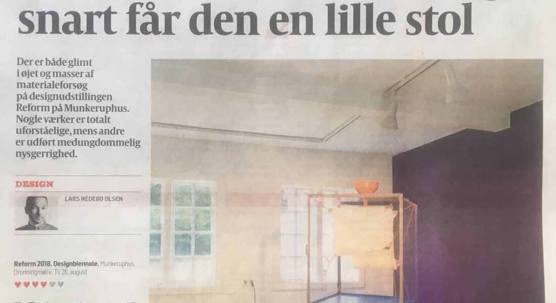 Politiken bragte d. 26. juni en flot anmeldelse af RE F O R M Designbiennale, der får hele 4 stjerner og masser af rosende ord til Munkeruphus og Gunnar Aagaard Andersen.