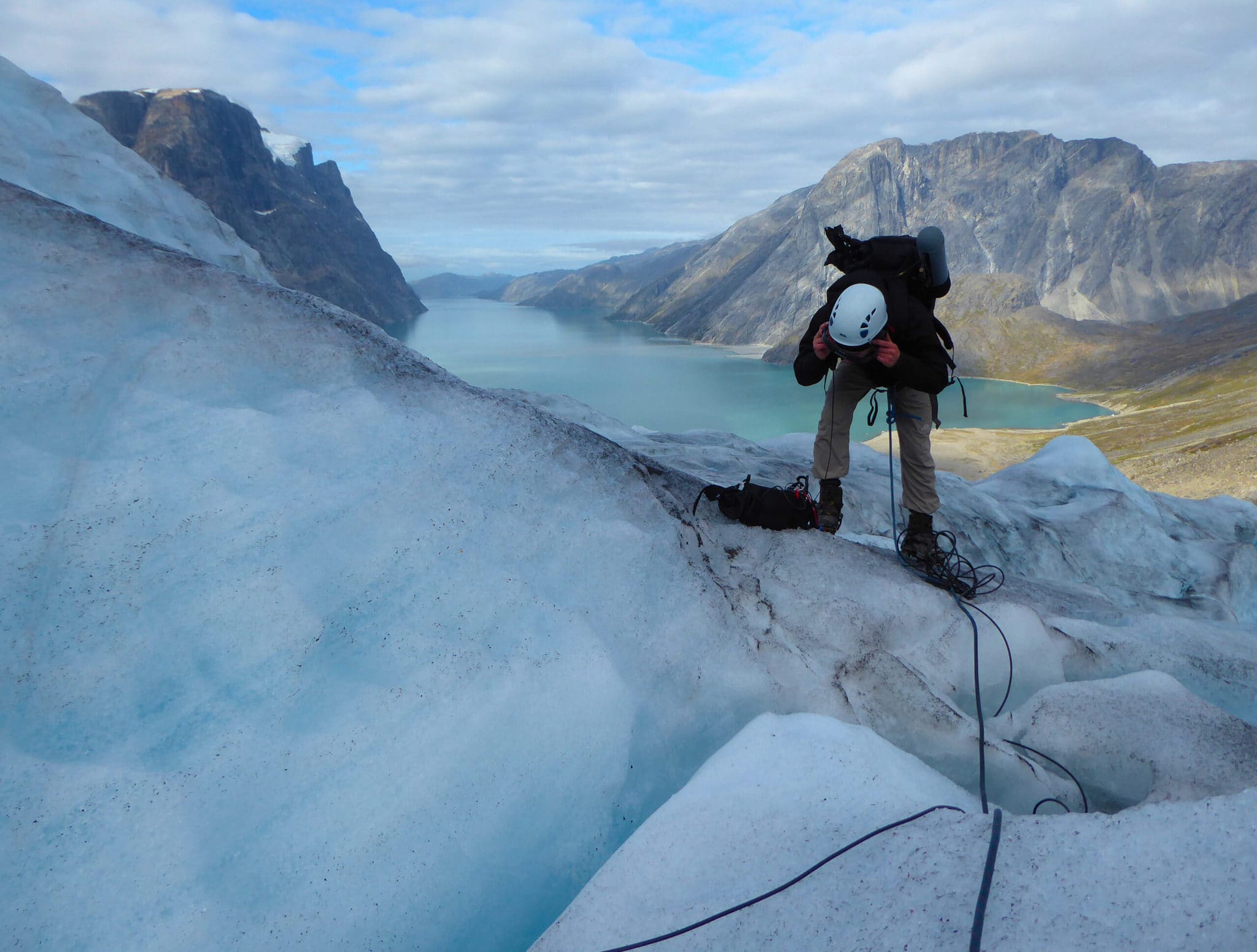 26 februar 2020 Feltoptagelser med hydrophoner 20 meter ned i en gletsjer-sprække, Grønland, 2016_Photo by Arild Midtbø Kalseth